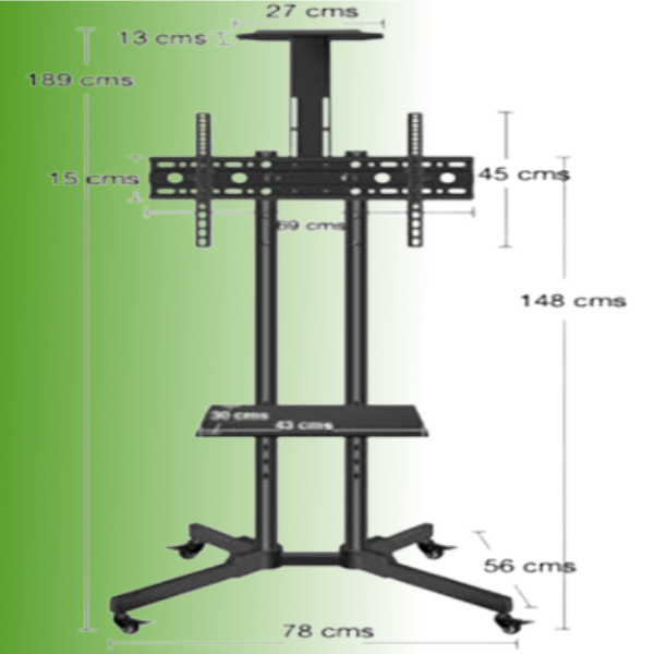 Soporte pedestal para TV LCD, led y plasma de 32″ a 65″ con ruedas giratorias de freno, incluye soporte para DVD. peso máximo 50 kg, Vesa 200 x 200 mm – 300 x 300 mm – 400 x 400 mm – 600 x 400 mm, altura regulable mínima 164 cm y máxima de 180 cm.
